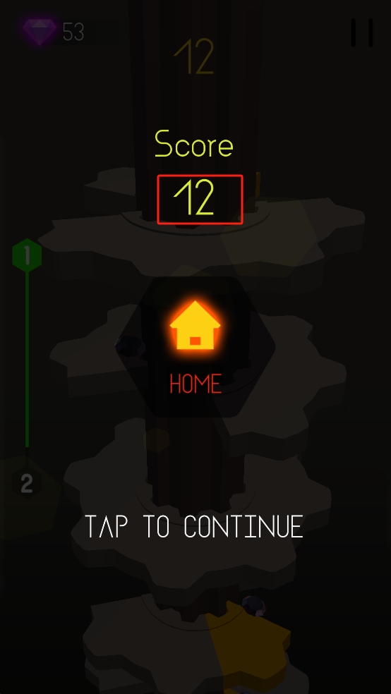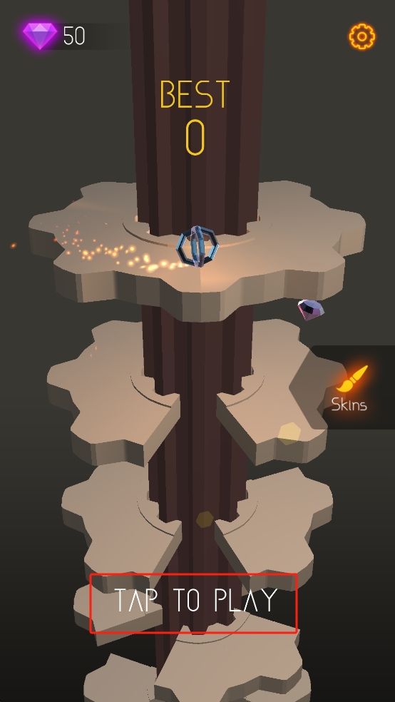 1、点击TAP TO PLAY启动游戏,操控蓝色六边形沿齿轮柱下落,避开齿轮缺口,收集紫色宝石。