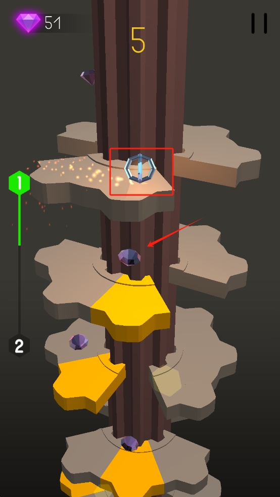 2、游玩的过程中适时点击屏幕,使六边形下落至黄色平台,持续收集宝石,留意齿轮旋转的缺口。