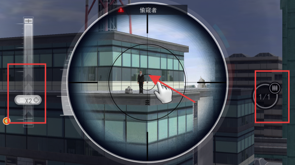 3、在狙击游戏场景中,利用左侧的倍率调整按钮和右侧的射击按钮,瞄准红色箭头所指的目标,完成狙击任务。