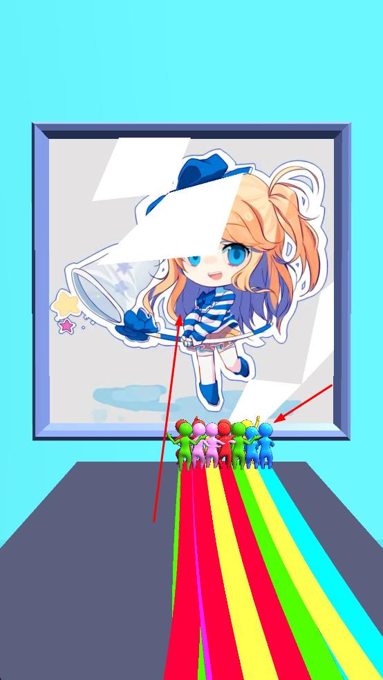 3、留意上方的进度条和关卡标识,引导小人队伍冲向终点,最终队伍会在一幅卡通女孩画像前结束,完成关卡任务。