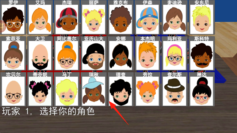 1、玩家1在角色选择界面,点击箭头指的角色,确定自己要猜的人物,进入对战。