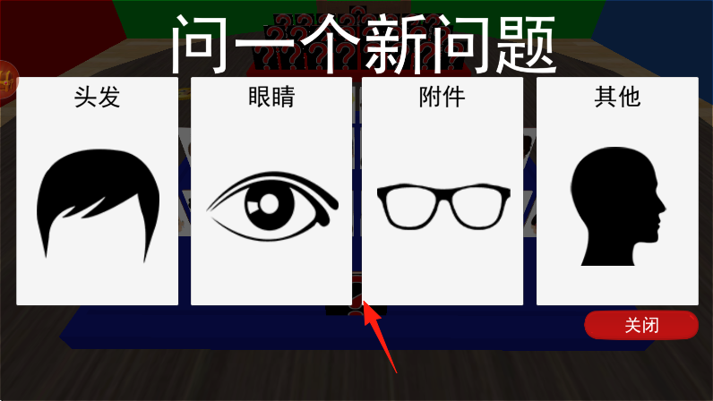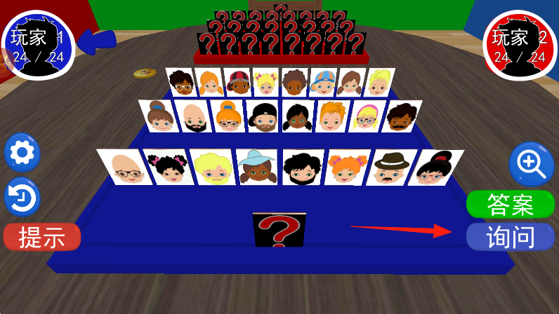 2、进入游戏,双方通过询问按钮,依据对方角色特征,如头发、眼睛等,缩小范围,按箭头点询问发起提问。