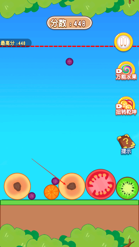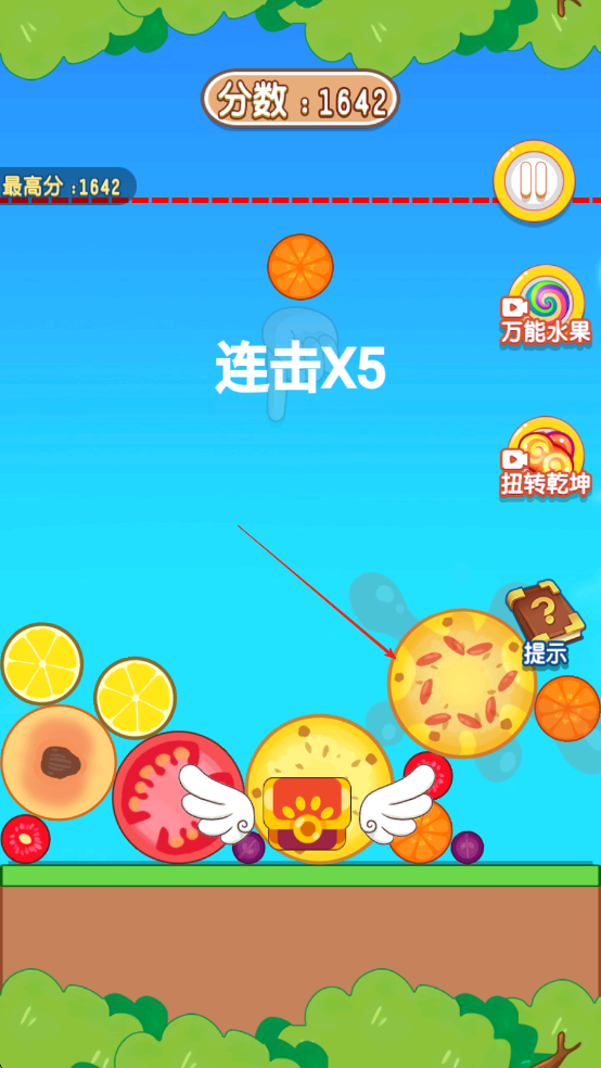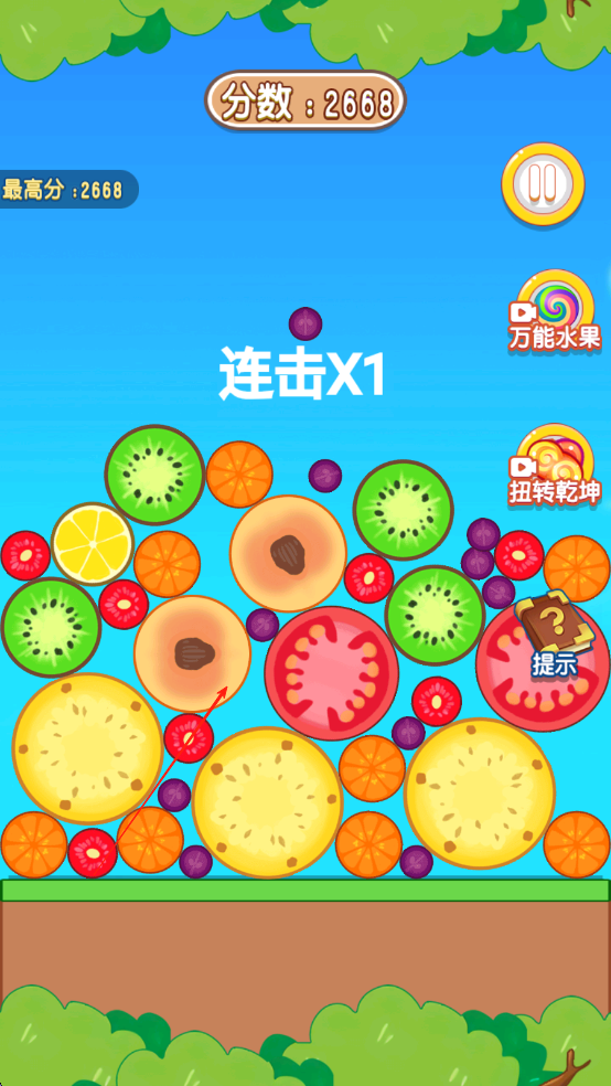 2、持续滑动相同水果使其合成更大水果,注意控制水果堆积高度,避免超过警戒线,积累分数推进进度。