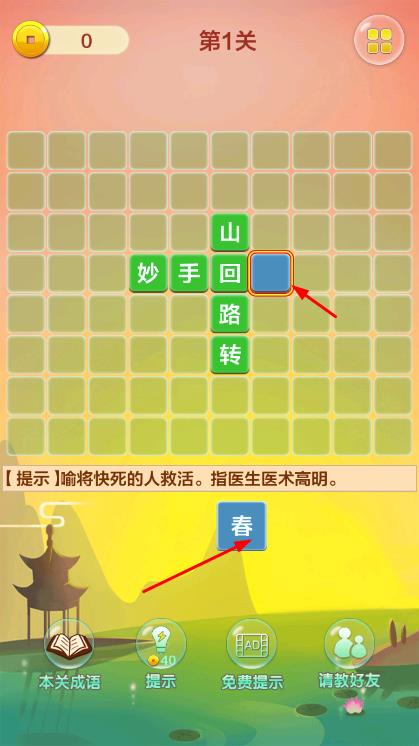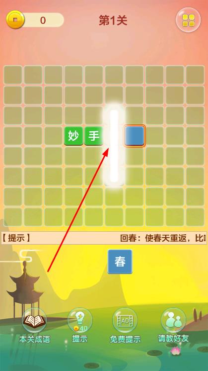 1、进入关卡1,根据界面已有的成语字块和下方提示字,拖动提示字到合适的空白方格处,填充成语。