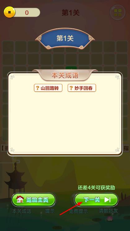 3、成功完成当前关卡成语填字,点击下一关继续挑战。