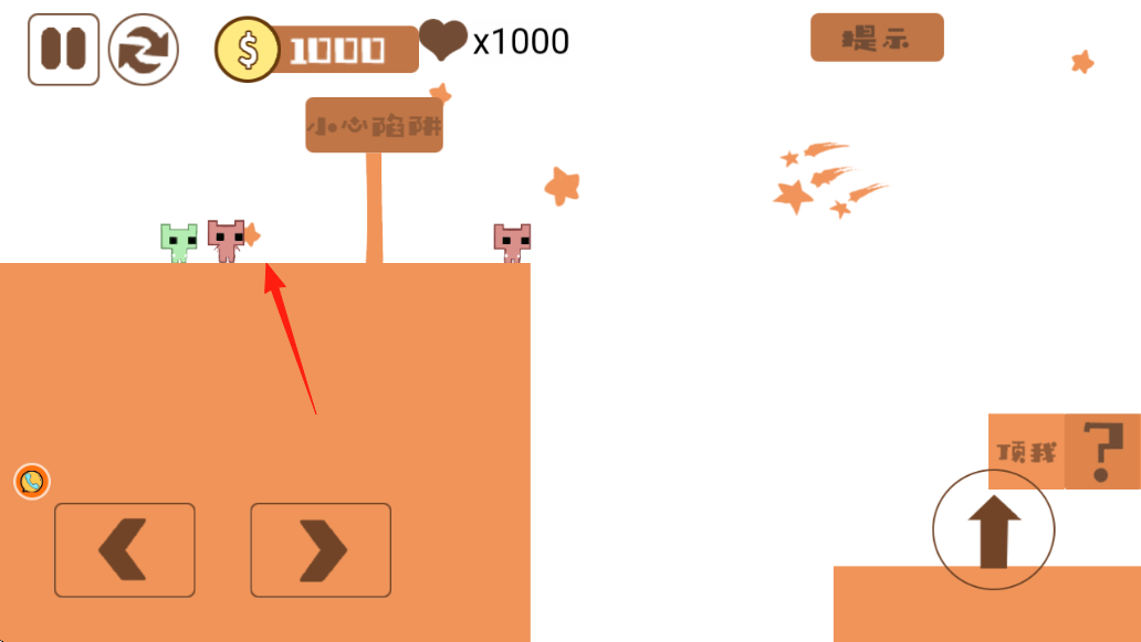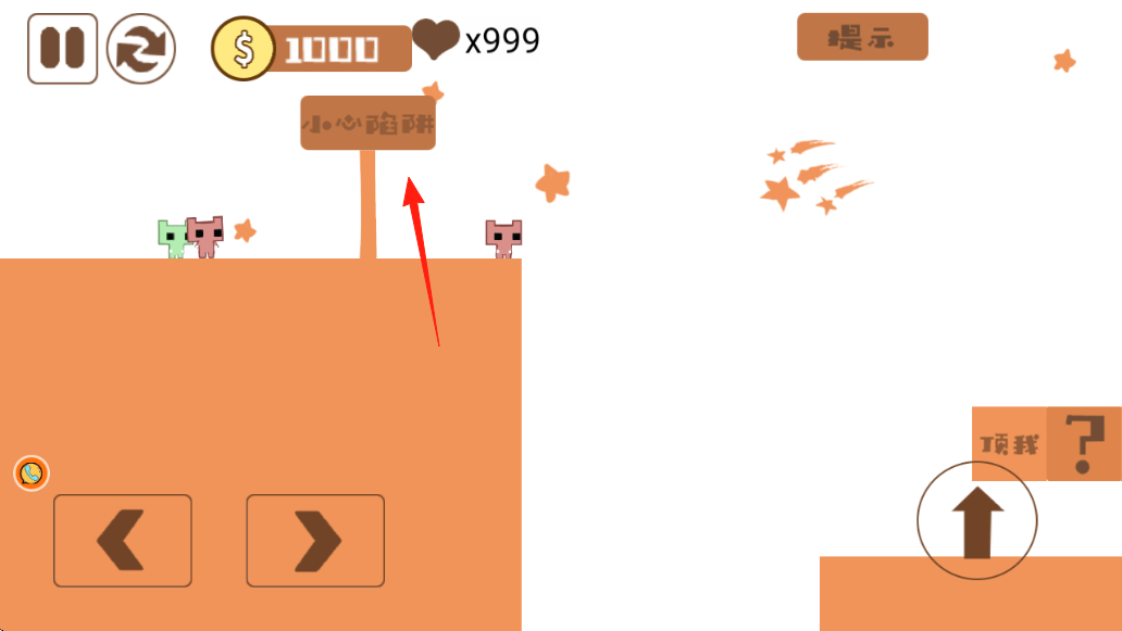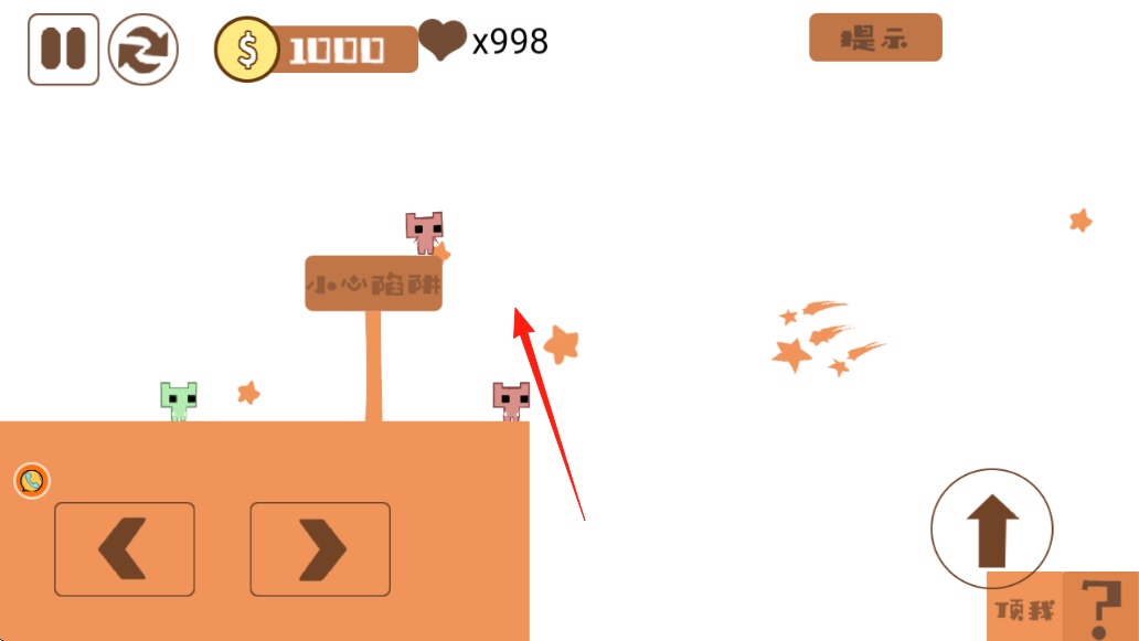 3、最后,跟随箭头,操控绿猫跨越地形,避开陷阱,接近目标粉色小猫,完成关卡探索。