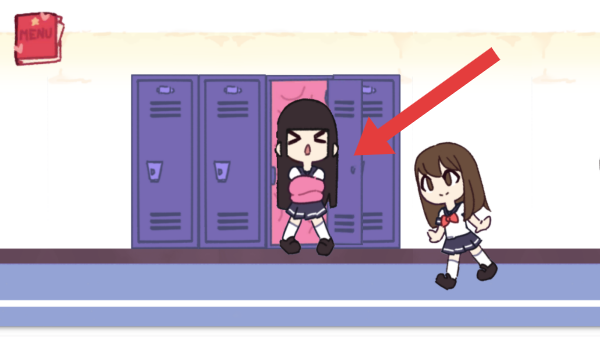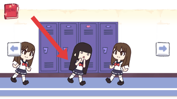 2、呈现校园储物柜场景,有三个穿校服的卡通女孩,左侧有MENU标识及方向箭头按钮,属于校园环境与角色互动的场景片段。