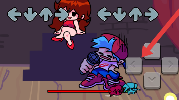 3、画面中有两个卡通角色,上方有音符按键提示←↓↑→,下方有操控按钮,红色进度条可能代表得分或生命值,属于进行中的场景。