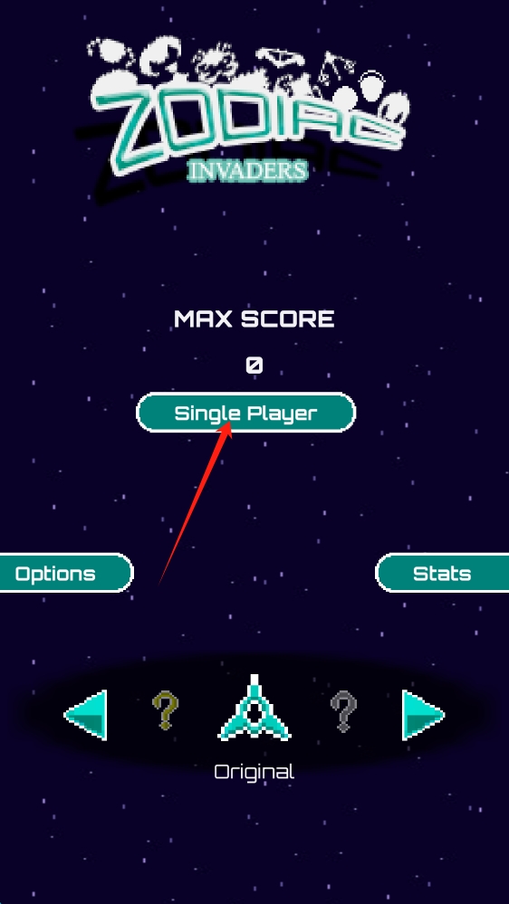 1、在Zodiac-Invaders游戏启动界面,跟随箭头提示,点击Single Player,点击开始游戏。