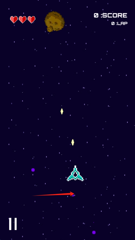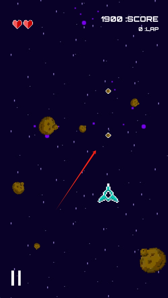 2、进入游戏操作场景,根据箭头提示,操控飞船,躲避陨石,收集道具,滑动移动人物。