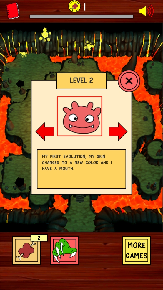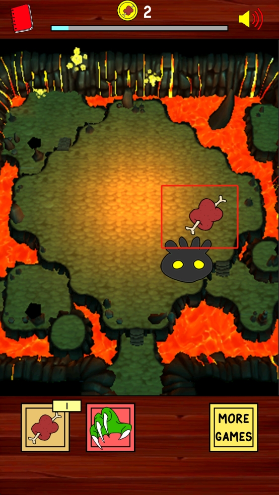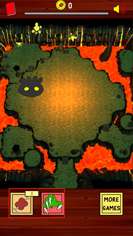 2、持续投放肉块,引导黑色怪物在熔岩场景内移动觅食,每次进食使金币计数增加,逐步积累进化条件。