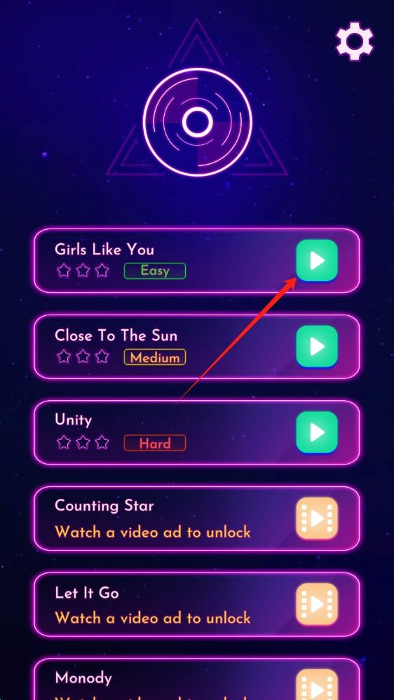 1、在游戏歌曲选择界面,跟随箭头提示,选择喜欢的歌曲,开启音乐节奏挑战,点击开始游戏。