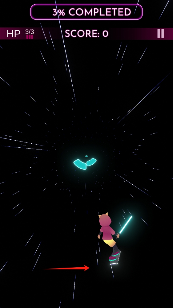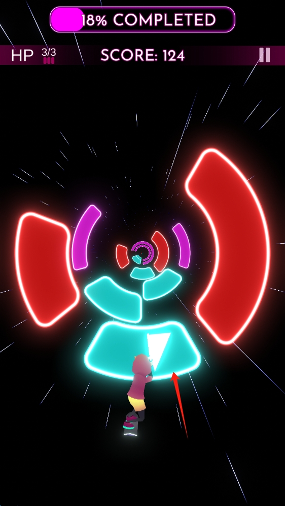 2、进入游戏操作场景,根据箭头提示,操控角色,按照音乐节奏移动,躲避障碍,滑动移动人物。