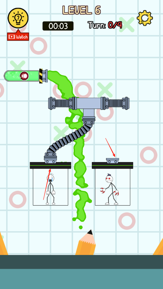 2、管道口均可拆卸移动,先将毒液和管道连接在一起,让毒液顺着管道往下流,再将连接在好人的管道连接到敌人的箱子上。