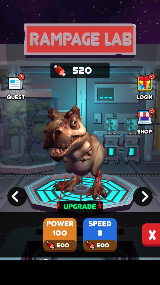 3、可进入RAMPAGELAB界面,通过消耗道具提升恐龙的能力,努力提升角色实力,在城市破坏中获得更高分数。