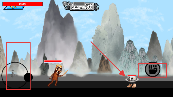 3、在游戏战斗场景中,利用左侧的虚拟摇杆控制角色移动,点击右侧的攻击按钮,对红色箭头所指的敌人发起攻击,击败敌人获取得分。