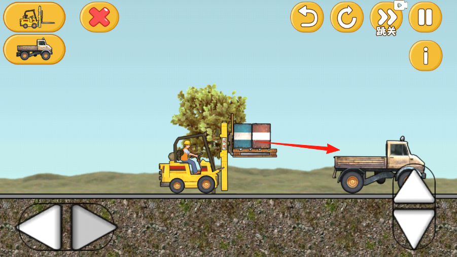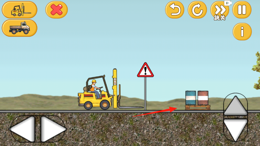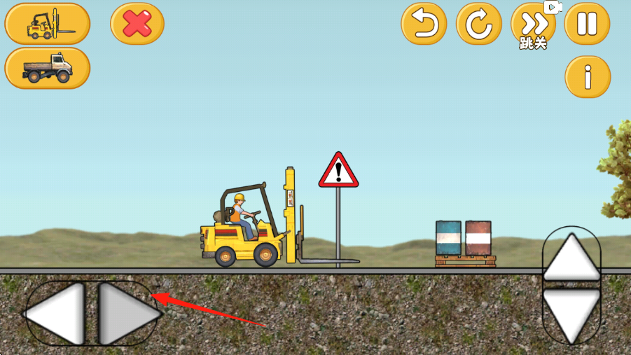 1、用左下角左右箭头箭头指的方向键,操控黄色叉车移动,靠近货物托盘。