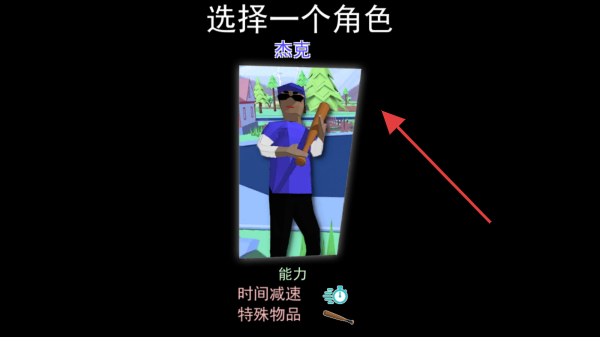2、在角色选择界面,选择红色箭头所指的角色杰克,该角色具有时间减速能力和特殊物品棒球棍,进入游戏。