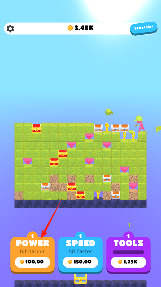 1、在打工人打工游戏界面,点击POWER按钮,消耗金币提升攻击力,通过强化力量属性,让角色挖矿更高效,打破坚硬方块,获取更多宝藏,体验属性升级机制。