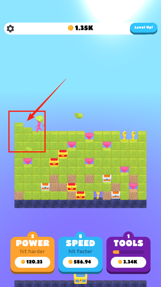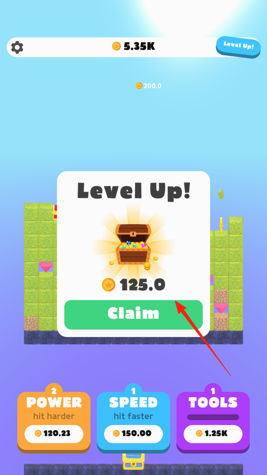 2、当角色升级后,出现Level Up弹窗,点击Claim,领取升级奖励金币,利用奖励,继续强化属性或解锁工具,助力挖矿进程,体验升级收益玩法。