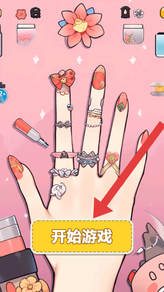 1、画面中有装饰着美甲、饰品的手,还有化妆品、花朵等装饰元素,点击开始游戏的按钮,用于引导玩家进入。