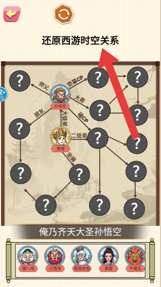 3、根据任务提示还原西游时空关系,每个人物框旁都有文字提示,根据提示进行拉取相对应的人物。