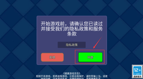 1、点击红框绿色同意按钮,确认隐私政策开始游戏。