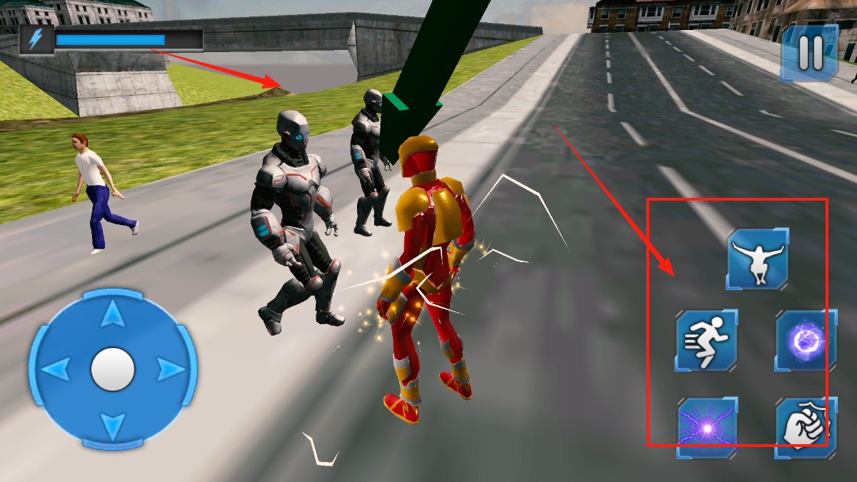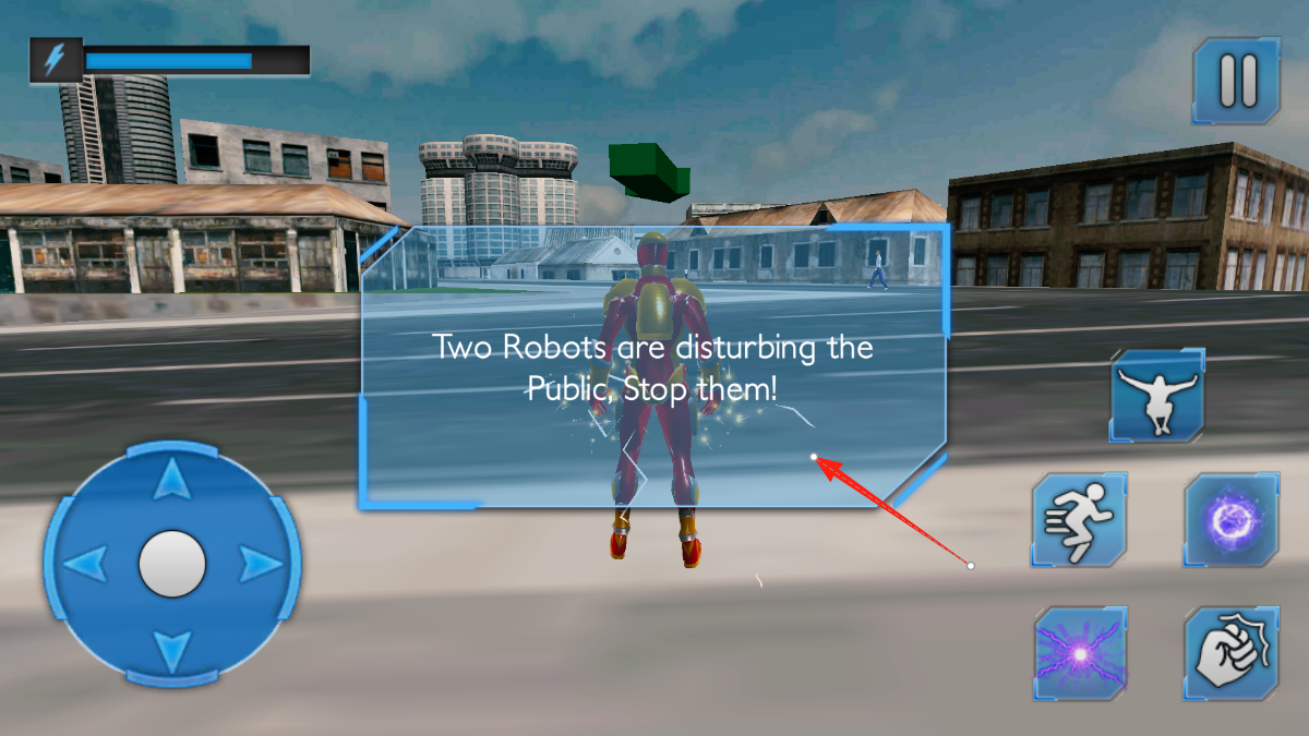 3、遭遇机器人后,点击右侧技能按钮释放不同招式,通过组合技能攻击机器人,保护市民,同时躲避机器人反击,体验战斗操作玩法。