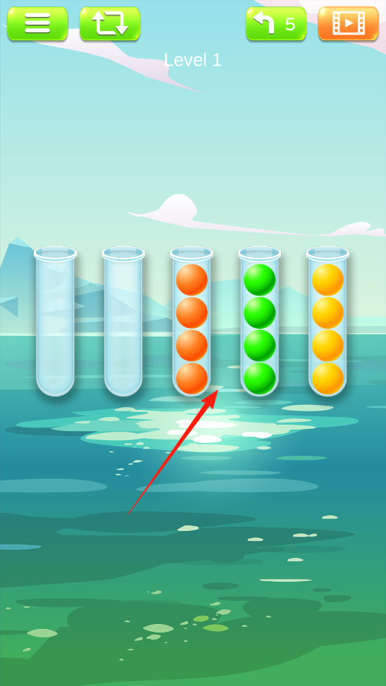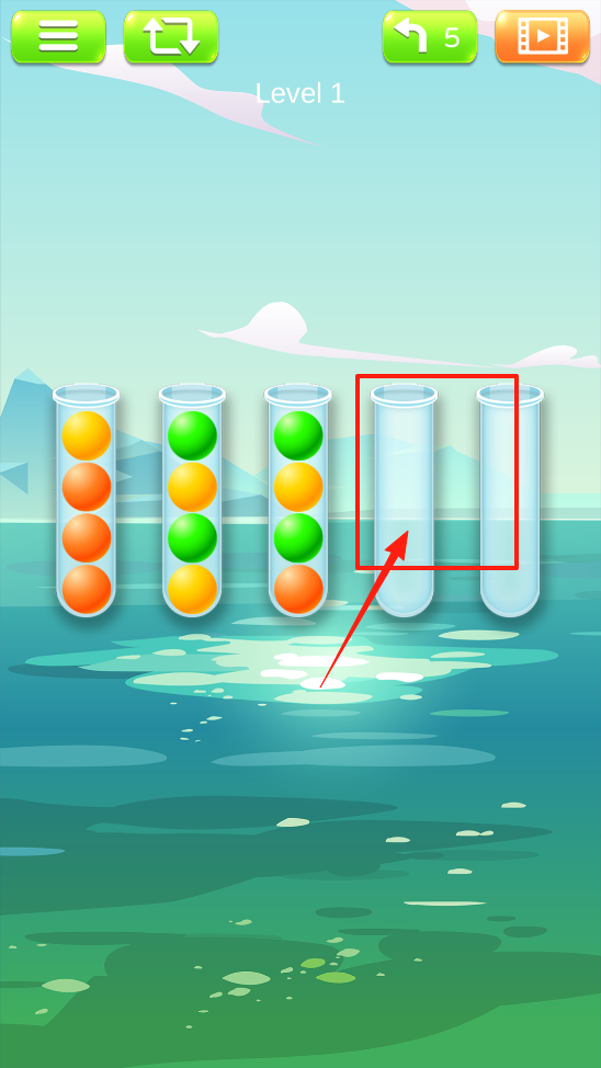 1、进入颜色水排序第一关,观察各试管内彩球分布,点击有彩球的试管将彩球移至空试管规划彩球分类存放,开启颜色分类挑战,体验彩球移动初始流程。