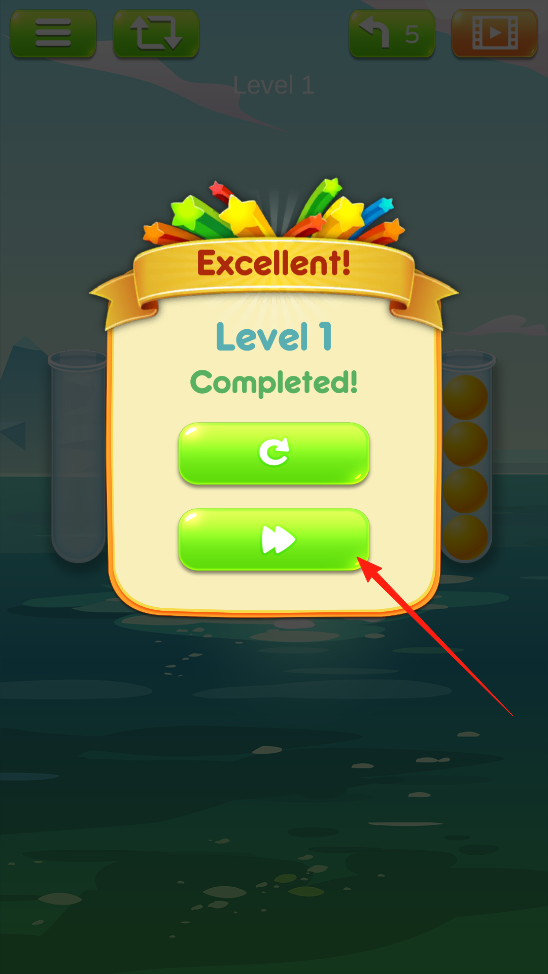 3、完成第一关后,界面显示Level1Completed,点击绿色箭头按钮进入下一关,通过此操作推进游戏进度,挑战更复杂的彩球分类关卡,体验关卡衔接玩法。