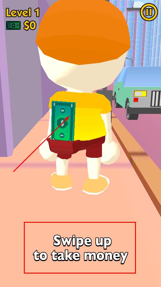 2、接近目标角色身着黄衣、背部显示钱币标识时,依据界面提示Swipe up to take money,通过向上滑动操作,完成对目标角色身上钱财的夺取动作。