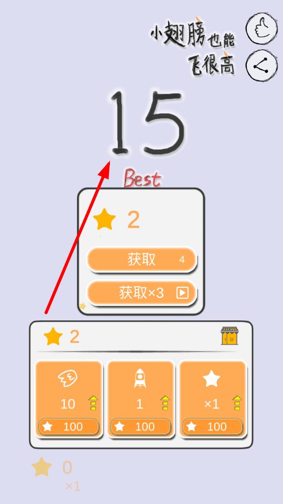 3、飞行结束后,关注箭头指向的分数等数据,可通过下方按钮获取奖励,用于提升小鸟飞行能力,准备下一次挑战。