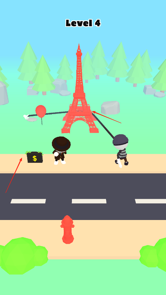2、将小偷的手绕过铁塔和气球,绕过人的背后偷走人的钱包,偷到自己的身边即可。