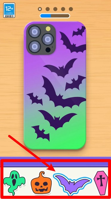 2.选择不同的图案元素来装饰手机壳,比如南瓜、蝙蝠或幽灵,通过自由搭配让作品更有个性和创意。