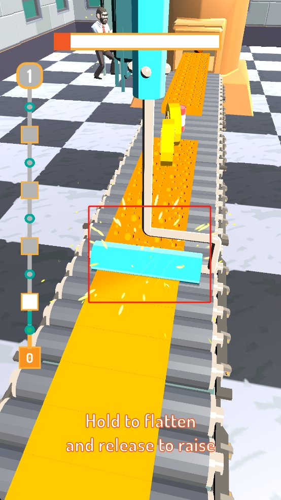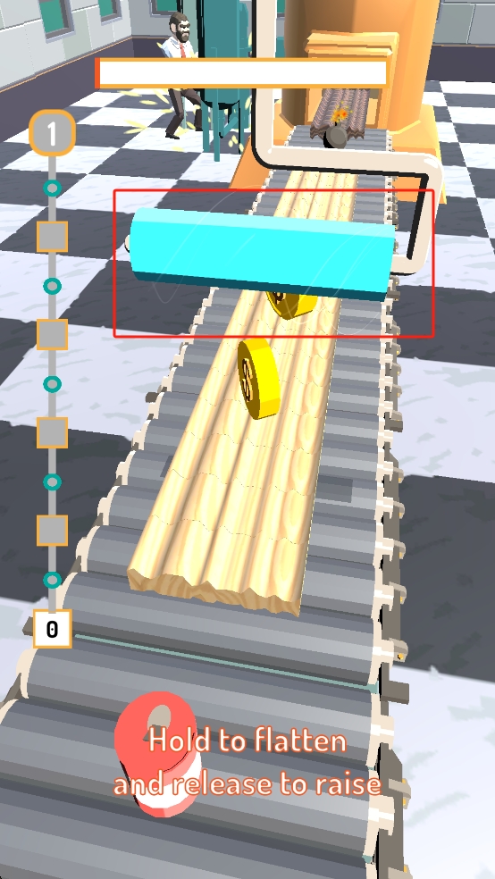 1、工厂传送带场景中我们根据提示,长按屏幕控制蓝色压板下压,平整传送带上的木材与金币,推进加工流程。