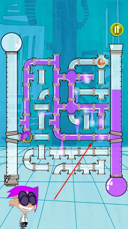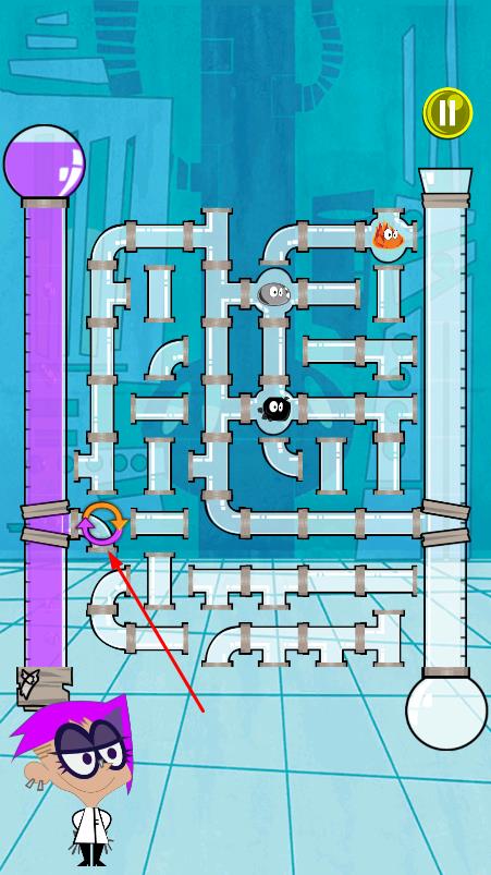2、目标是通过旋转管道,构建出一条连通的管道线路,使得左侧紫色管道中的液体能够顺利流入管道网络,并将管道内的生物冲出来,让液体最终流入右侧的容器中。