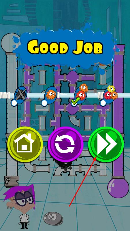 3、成功完成管道连接,使液体顺利流动并冲出生物后,即可过关,点击绿色箭头按钮,进入下一关。