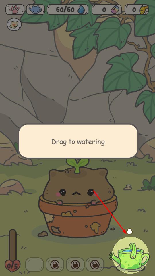 1、首先在游戏界面,拖动右下角绿色水壶向盆栽拖动,按Drag to watering提示完成浇水操作。