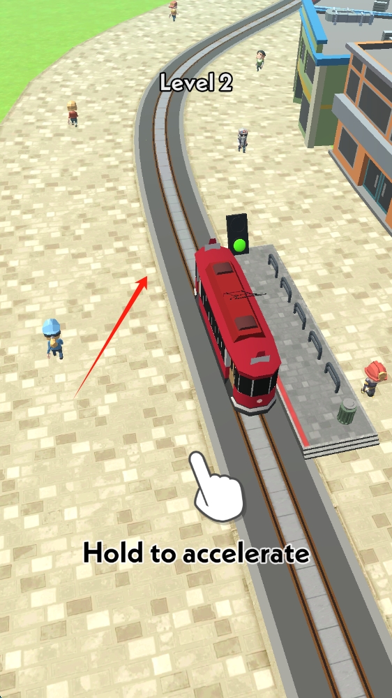 3、继续在游戏操作场景中,根据箭头提示,按住屏幕加速,应对复杂路况,提升驾驶技巧,推进游戏进度。