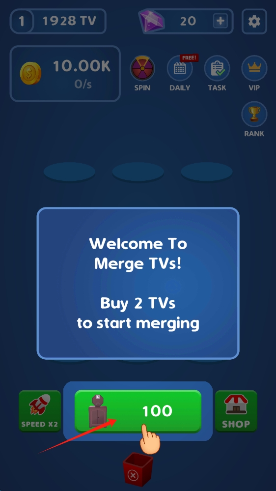 1、在Merge-TVs!游戏启动界面,跟随箭头提示,点击100按钮,开启合并电视冒险,进入游戏世界。