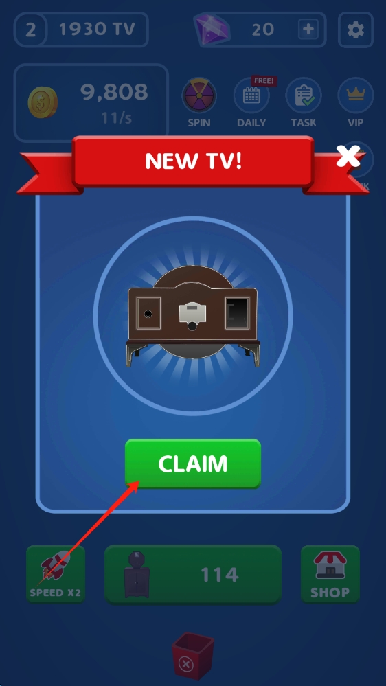 2、进入新电视获取界面,根据箭头提示,点击CLAIM,领取新电视,为合并电视做好准备。