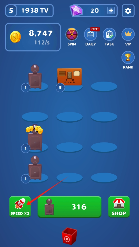 3、在游戏操作场景中,根据箭头提示,利用SPEEDX2功能,加速合并电视的过程,完成游戏任务,推进游戏进度。