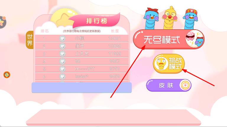 1、进入游戏,在模式选择界面,点击无尽模式或挑战模式,开启贪吃蛇闯关。
