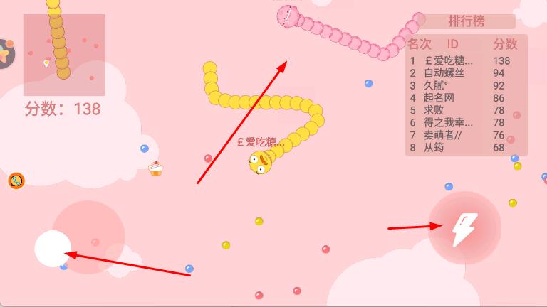 2、通过滑动屏幕或点击方向按钮,控制贪吃蛇移动,遇到其他贪吃蛇时,可通过灵活走位,将其击杀并吞噬残骸。