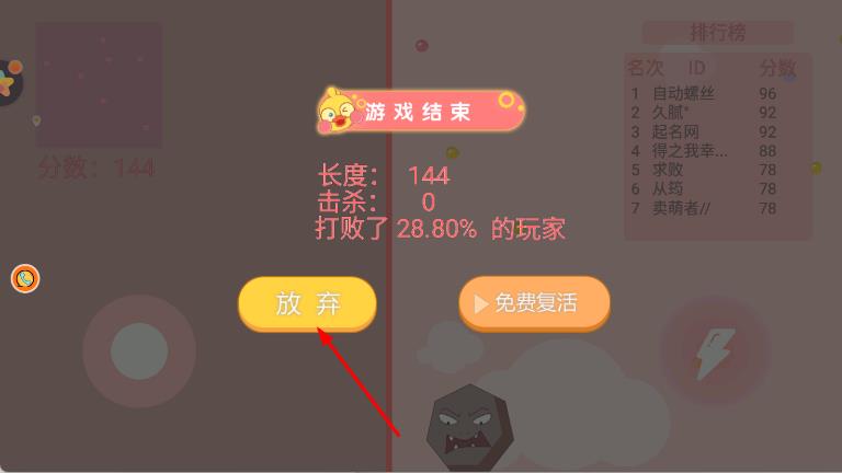 3、持续吞噬成长,成为场景中的霸主,若贪吃蛇头部撞到其他蛇身或边界,游戏结束,可选择放弃重新开始。