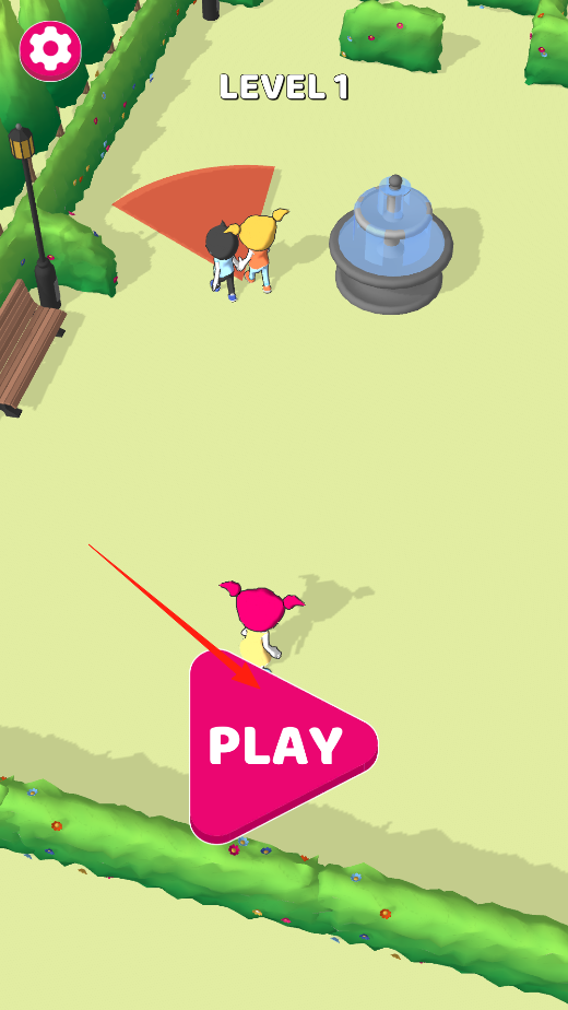 1、在偷个男朋友关卡1界面点击PLAY开始游戏,操控粉色头发角色在公园场景移动,尝试接近目标人物,开启互动挑战,体验关卡启动机制。