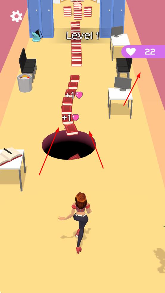 2、角色可以收集红色的书本和粉色的爱心道具,书本可以在跑道上搭建路径,爱心可以增加右上角的爱心数量。
