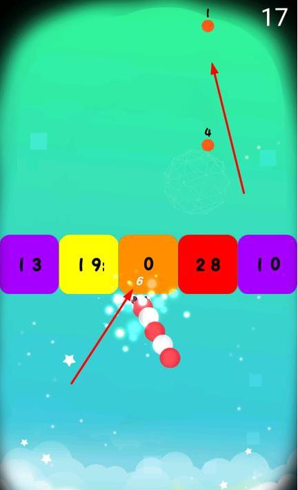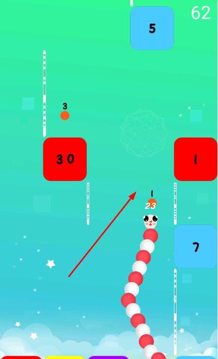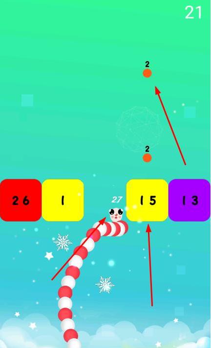 2、小蛇撞击后小蛇头部的数字会与方块上的数字相对应减少,操控小蛇去吃上方掉落的橙色小球,小球上也带有数字,同样能增加小蛇头部数字和身体长度。