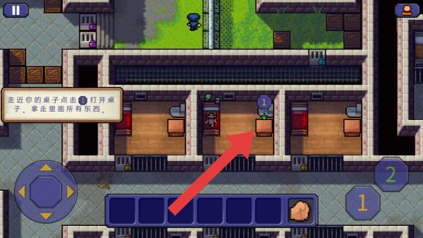 3、呈现监狱场景,有走近你的桌子点击①打开桌子,拿走里面所有东西的操作提示,玩家操控角色在监狱房间活动,属于收集物品的基础流程环节。