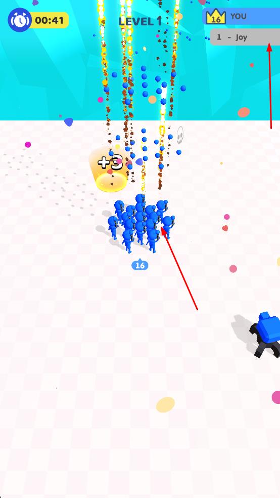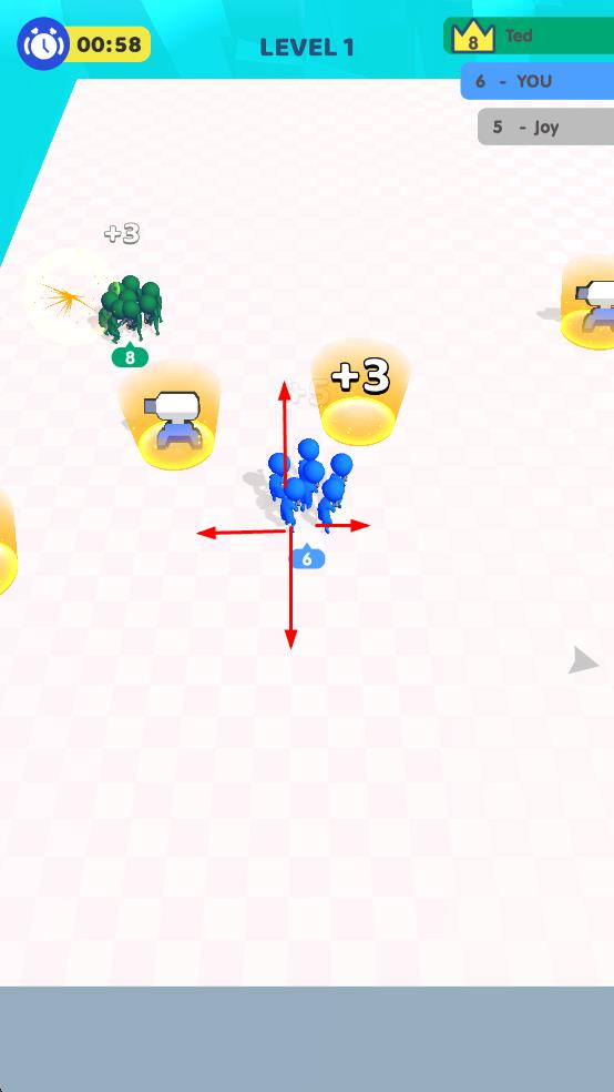 3、会遇到其他颜色的小人队伍,通过收集道具壮大自己的队伍,与其他队伍竞争,争取获得更高的排名,向关卡终点前进。
